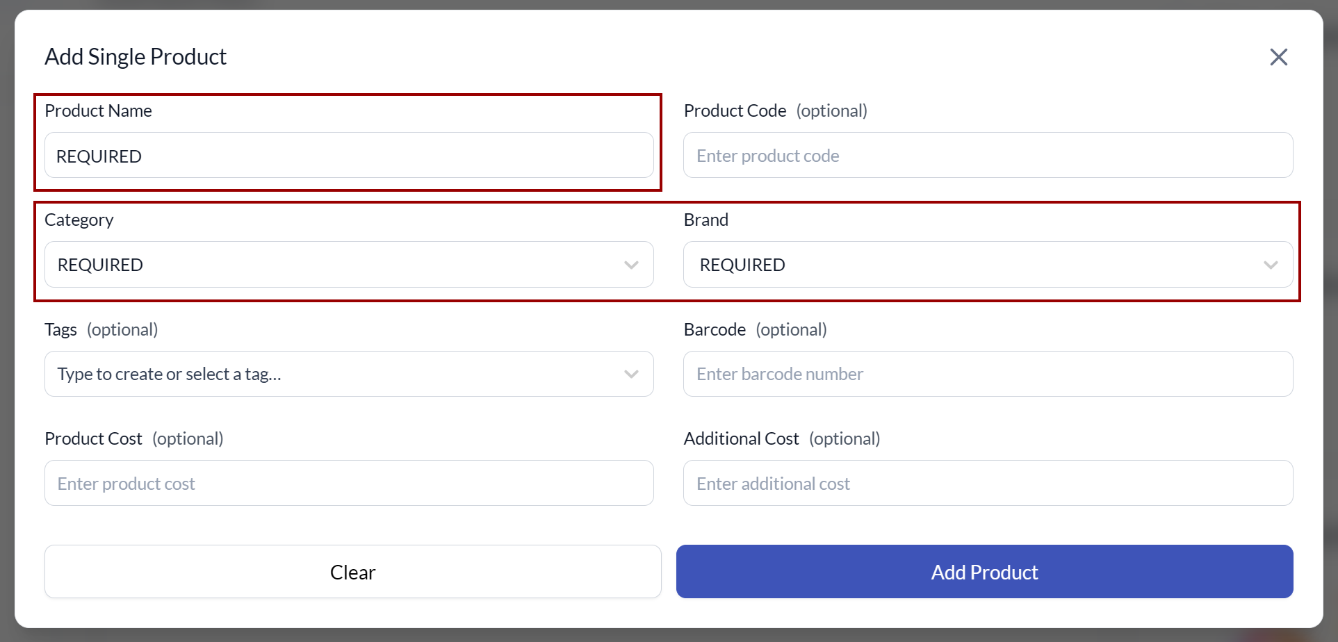 On the Products page, click Add Single Product. Required fields when adding new products are: